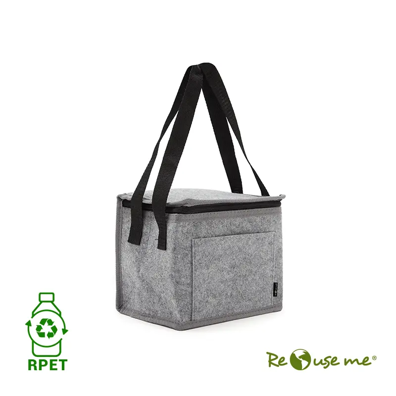 Cooler fabricado en fieltro de RPET, confeccionada a partir de botellas recicladas, con 2mm de espuma de polietileno laminado con película de aluminio. Ideal para transportar comida y bebida, conservando el frío. Dimensiones: 20,5 x 18 x 15 cm. Capacidad 5L. Reuseme.