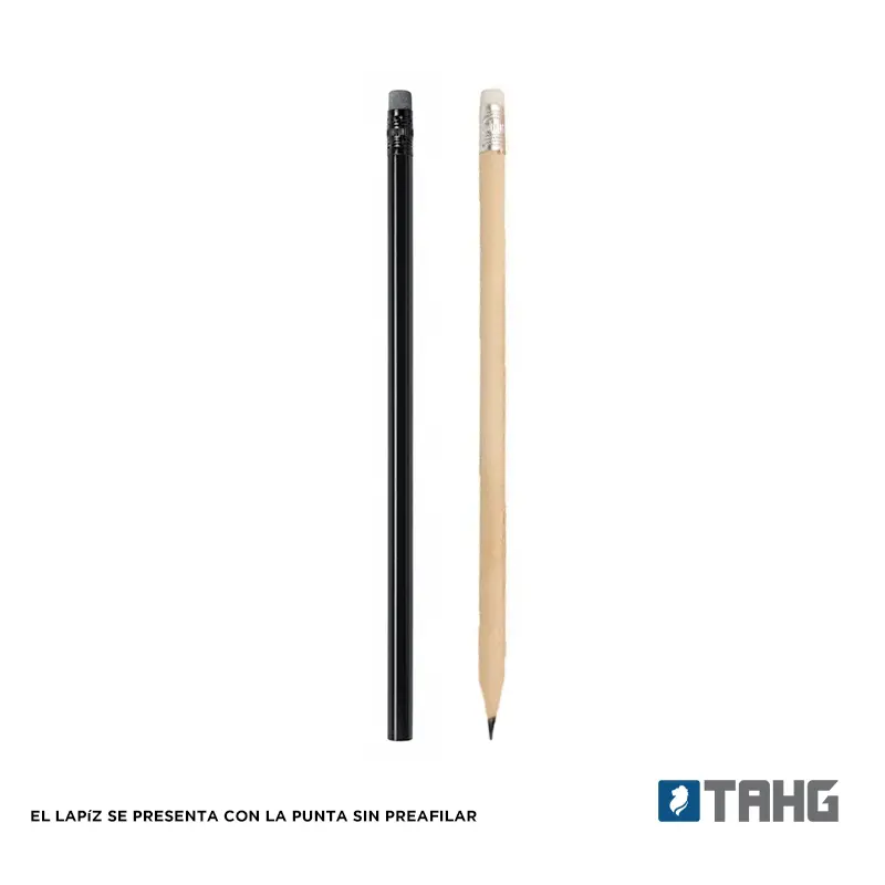 Lápiz grafito con goma. Realizado en madera con detalle de aluminio en reborde de goma. Material de la goma: Caucho. Punta sin preafilar. Medidas: 189 mm x Diámetro 0,8 mm. Mina: 2mm.