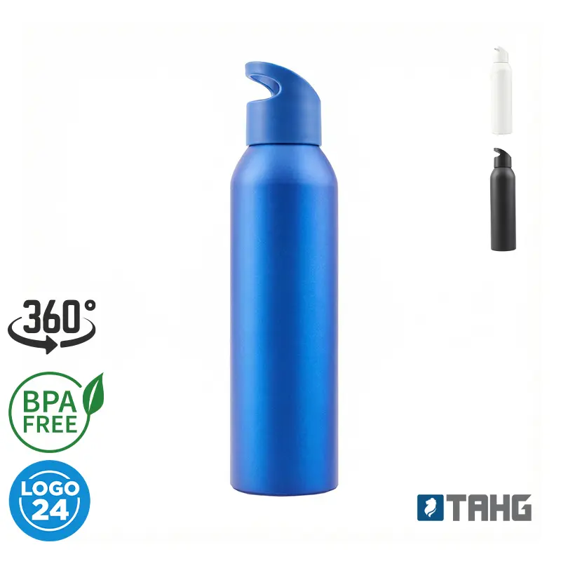 Sport Bottle reutilizable de aluminio con tapa rosca de PP y silicona. Cuenta con una tapa con agarre para facilitar su transporte. Producto libre de BPA. Medidas: 27 cm x Diámetro 6,6 cm. Capacidad: 650 ml.