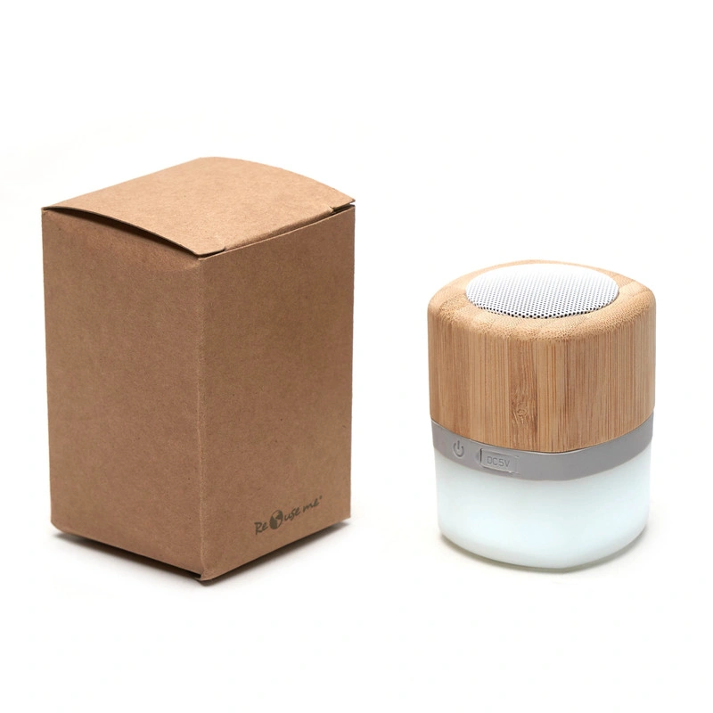 Parlante portátil con tecnología Bluetooth. Realizado en combinación de ABS con Silicona y bamboo, con iluminación en la base. Características técnicas: Batería de 300mAh | Poder del parlante: 3W | Frecuencia: 200Hz-20KHz | Conexión: 5V / 500mA | Distancia de alcance: 10 Metros | Peso 150gr | Medidas: 6 x 6 x 7,5 cm. ReUseMe. Incluye Gift Box confeccionada en cartulina Kraft.